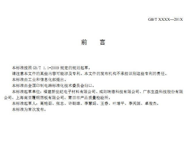 國家標(biāo)準(zhǔn)GB/T XXXX-201X《多層印制板用粘結(jié)片通用規(guī)則》由咸陽瑞德科技有限公司與福建新世紀(jì)電子材料有限公司廣東生益科技有限公司、上海南亞覆銅箔板有限公司、莆田市產(chǎn)品質(zhì)量檢驗(yàn)所、中國電子技術(shù)標(biāo)準(zhǔn)化研究院共同負(fù)責(zé)起草。
